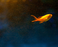 一个偶然的机会,我在花鸟市场遇见了他。那么一筐的鱼,我只对它情有独钟。它穿着一身金黄色的衣服,尾巴呈现白色,虽躲在一个角落里但引人注目。我将它买下,放入大鱼缸里养着。