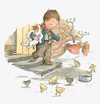 它教鸡雏们啄食,掘地,用土洗澡,一天不知教多少次。它还半蹲着,让它们挤在它的翅下、胸下,得一点儿温暖。它若伏在地上,鸡雏们有的便爬到它的背上,啄它的头或别的地方,它一声也不哼。