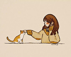 我的女儿最喜欢它。有时她正在写稿,忽然猫伯伯跳上书桌来,面对着她,端端正正地坐在稿纸上了。她不忍驱逐,就放下了笔,和它玩耍一会。有时它竟盘拢身体,就在稿纸上睡觉了,身体仿佛一堆牛粪,正好装满了一张稿纸。有一天,来了一位难得光临的贵客。我正襟危坐,专心应对。“久仰久仰”,“岂敢岂敢”,有似演剧。忽然猫伯伯跳上矮桌来,嗅嗅贵客的衣袖。我觉得太唐突,想赶走它。贵客却抚它的背,极口称赞:“这猫真好!”话头转向了猫,紧张的演剧就变成了和乐的闲谈。