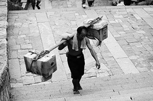 奇怪的是挑山工花的时间并不比游人多。你轻快地从他们身边越过,以为把他们甩在后边很远了。你在什么地方饱览壮丽的山色,或者在道边诵读凿在石壁上的古人的题句,或者在喧闹的溪流边洗脸洗脚,他们就会不声不响地从你身旁走过,悄悄地走到你的前头去了。等你发现,你会大吃一惊,以为他们是像仙人那样,是腾云驾雾赶上来的。