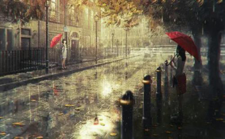 少女正坐在店门前。少年撑开雨伞,与其说是为了挡雨,莫如说是为了掩藏自己走过 少女面前时流露出来的羞涩。