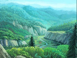 我们骑马在山谷中穿行,两侧是沿山坡延展开来的森林。我猜测那些都是杉树,它们集聚在一起,带着各种层次的绿色,生动而惊人的色块与柔和苍白的颜色相调和,而低处和顶端则是银绿色,还有昏沉暗黑的绿色,一丛丛如铺展开的阴影。它们从我们眼前延伸出去,層层叠叠,无可计数,令人眼花缭乱,最终迷失在大山的峭壁之中。