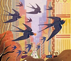 那天黄昏,天下着小雨,它们衔完最后一趟泥,向我们亲热地打了几声招呼,又飞走了。我追着它们的身影,飞快地跑出去,跑向原野,我终于看见它们了。它们并肩依偎着歇在电线上,在夜晚的寒风中,紧挨着羽毛相互取暖。露天过夜。