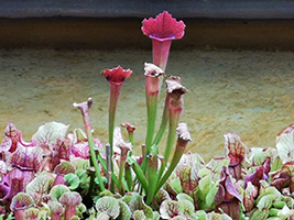 太阳瓶子草色彩艳丽,是一种食虫植物。叶子形似瓶子,直立或者倾斜,可收集雨水,也能分泌蜜汁。香甜的蜜汁吸引来昆虫,落入“瓶”中,溺水而死,成了太阳瓶子草的美餐。