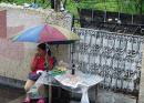 在一个下雨天,我没带伞,便匆匆跑到一个公交车站等车。车站旁有个撑着大阳伞的小书摊,我连忙跑到书摊下避雨。 这时,我注意到这个卖书的人。他坐在那儿,脑袋右上角好像少了块肉,竟像是被刀削得平平的!我倒吸一口冷气:他怎么会有这么奇怪的脑袋?他该不会是个疯子吧?听说前段时间有个疯子在马路上用锤子砸伤了一个小孩! 想到这,我更是心惊胆战,还是离开这个“疯子”远点吧,万一他…… 为了安全,我就悄悄地走出了阳伞,站在雨中淋。突然,我感到背后有双眼睛在盯着我看。该不会是那个‘疯子’神经病发作,想在我背后做什么手脚吧。我的心猛烈地跳了起来。幸好这时车来了,我两步并做一步上了车。 透过车窗,我回头看那个“疯子”,他竟在和另一个人交谈着。我想:看来,他不像是“疯子”啊!但他那个与众不同的“脑袋”怎么会少了块肉呢? 真是奇怪。