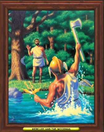 有个樵夫在河边砍柴,不小心把斧子掉到河里,被河水冲走了,他坐在河岸上失声痛哭。赫耳墨斯知道了此事,很可怜他,走来问明原因后,便下到河里,捞起一把金斧子来,问是否是他的,他说不是;接着赫耳墨斯又捞起一把银斧子来问是不是他掉下去的,他仍说不是;赫耳墨斯第三次下去,捞起樵夫自己的斧子来时,樵夫说这才是自己所失掉的那一把。赫耳墨斯很赞赏樵夫为人诚实,便把金斧、银斧都作为礼物送给他。樵夫带着三把斧子回到家里,把事情经过详细地告诉了朋友们。其中有一个人十分眼红,决定也去碰碰运气,跑到河边,故意把自己的斧子丢到急流中,然后坐在那儿痛哭起来。赫耳墨斯来到在他面前,问明了他痛哭的原因,便下河捞起一把金斧子来,问是不是他所丢失的。那人高兴地说:“呀!正是,正是!”然而他那贪婪和不诚实的样子却遭到了赫耳墨斯的痛恨,不但没赏给他那把金斧子,就连他自己的那把斧子也没给他。