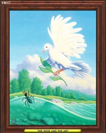 口渴的蚂蚁,爬到泉水旁去喝水,不幸被急流冲走。快要淹死时,鸽子看见他,连忙折断一根树枝,扔到水里,蚂蚁赶紧爬了上去,脱离了危险。后来,一个捕鸟人走来,用粘竿捕捉那只鸽子。蚂蚁见了,便咬了捕鸟人的脚一口。捕鸟人痛得丢下粘竿,鸽子立即惊跑了。这故事说明,人们应该知恩图报。