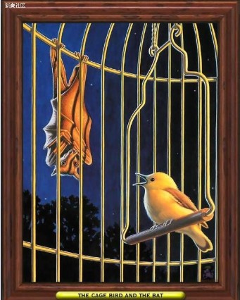 挂在窗口笼里的金丝雀,在夜里歌唱。蝙蝠听到后,飞过来问她为什么白天默默无声,在夜间却放声歌唱。金丝雀回答说,她这样是有道理的,因为他是在白天唱歌时被捉住的,从此他变得谨慎了。蝙蝠说:“你现在才懂得谨慎已没用了,你若在被捉住之前就懂得,那该多好呀!”