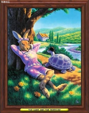 乌龟与兔为他们俩谁跑得快而争论不休。于是,他们定好了比赛的时间和地点。比赛一开始,兔觉得自己是天生的飞毛腿,跑得快,对比赛掉以轻心,躺在路旁睡着了。乌龟深知自己走得慢,毫不气馁,不停地朝前奔跑。结果,乌龟超过了睡熟了的兔子,夺得了胜利的奖品。 这故事说明,奋发图强的弱者也能战胜骄傲自满的强者。