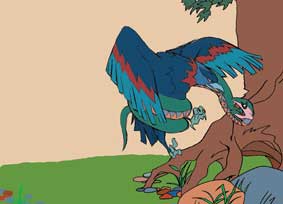 蛇和鹰交战,斗得难解难分。蛇紧紧地缠住了鹰。农夫看见了,便帮鹰解开了蛇,使鹰获得了自由。为了报仇,蛇在农夫的水杯里放了毒药。当不知情的农夫端起杯子正准备喝水时,鹰猛扑过来撞掉了农夫手中的水杯。有毒的水洒到了地上。