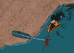 鹰在天空中飞翔,当他看见一只野兔时,就俯冲下来捕捉猎物。突然,有人一箭射中了它。鹰扇着翅膀降落在地面上。鲜血从伤口中喷涌而出。它低头看到箭尾竟是由一根它自己的羽毛制成的,就痛苦地说:“唉,我们总是给敌人提供毁灭我们自己的工具!”