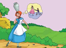 一个农家挤奶姑娘头顶着一桶牛奶,前往集市。走了一会儿,她开始算计起卖完牛奶后要买的东西:“我要买一身新衣服,好去参加舞会,年轻的小伙子都会邀请我跳舞。”想到这里,她真地摇起头来,牛奶桶随之倾倒在地,牛奶都流了出去。女孩很伤心,两手空空地回到家里,母亲对她说:“我的孩子,不要过早地打如意算盘。”