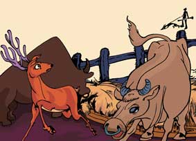 一只雄鹿被猎狗追赶得很急,跑进牛栏里,躲在一大堆干草里面,只有鹿角尖露在外面。猎人们很快来到牛栏,询问是否有人看到这头鹿。牧童们四处张望,什么也没有看到,于是猎人们走了。不久,主人回来了,他四处检查时,觉得有些异常。他指着那堆干草问:“那两个怪模怪样的东西是什么?”牧童们上前来翻寻,发现了那只鹿。