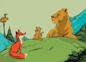 一天清早,雌狐狸带着她的孩子走出巢穴,看见了母狮子和她的孩子。“为什么你只有一个孩子,夫人?”雌狐狸问,“看我这群健康的孩子,如果有能力,一个骄傲的妈妈应该多养一些孩子。”母狮平静地说:“是呀,看看这漂亮的一大群,他们都是狐狸!我只有一个,可他毕竟是一头狮子。”