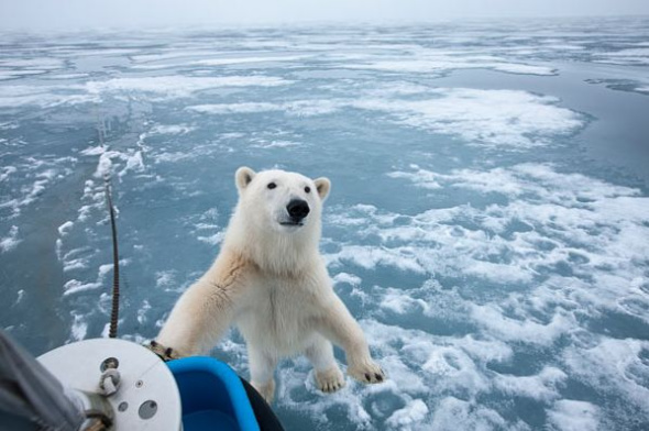 拍摄于伊明格角的萨比纳布科塔湾(位于挪威斯瓦尔巴特群岛的诺达斯兰德特)。一头北极熊(学名ursus maritimus)站在峡湾的冰面上,与勘探船的船首斜桅来了个亲密接触。