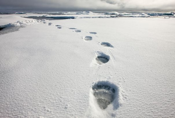 北极熊在雪地上留下的一串脚印。拍摄于斯瓦尔巴特群岛的斯皮特萨伯根岛。