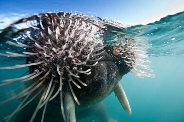 海象(学名odobenus rosmarus)一展泳姿。拍摄于斯瓦尔巴特群岛卡尔王子岛的普尔角