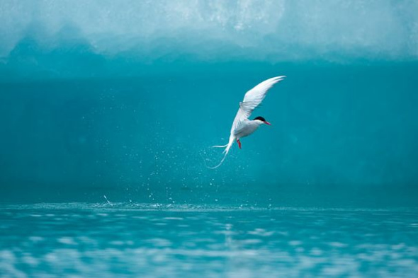拍摄于冰岛的斯卡夫塔费德国家公园。一只北极燕鸥正在冰川湖上捕鱼。