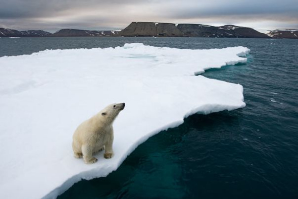 一头北极熊坐在融化的冰山上。拍摄于斯瓦尔巴特群岛。