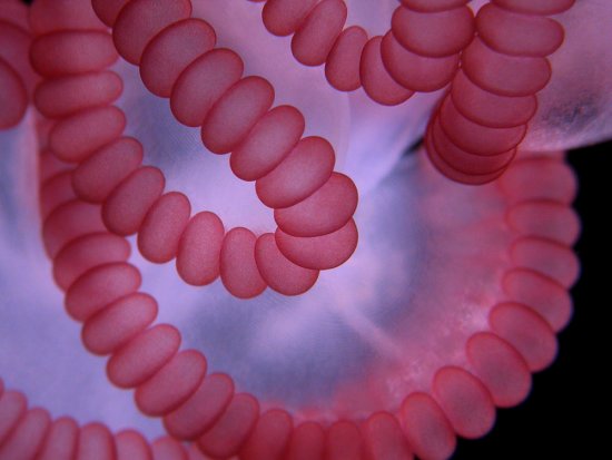 僧帽水母的死亡触须看上去像是娇弱的红色缎带,而缎带的珠链(每个直径约为300微米)却充满毒素,遇到猎物或无意中与人类接触时,毒素便会释放出来。巴西圣保罗大学的艾尔瓦罗·米格托(alvaro e. migotto)从该大学海洋生物学研究中心附近的小河中找到了僧帽水母,随即便用显微镜拍下这张照片。在此图中,令僧帽水母触须弹性十足的肌肉束看上去像一条条弯弯曲曲的白线。