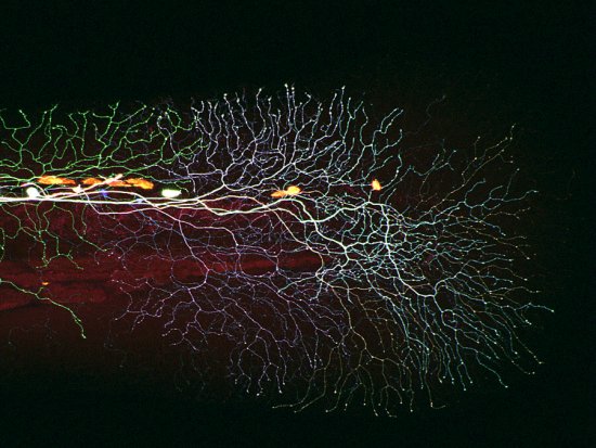 覆盖于三天大斑马鱼幼体尾巴的感觉轴突。阿尔伯特·潘(albert pan)用红色、青色和黄色荧光蛋白将轴突标注出来。