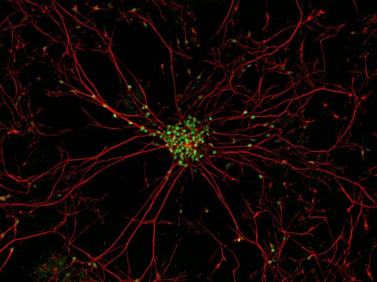 经过特殊处理,肌萎缩侧索硬化症患者的皮肤细胞变成了干细胞,接着干细胞又分化为运动神经元,即引发这种疾病的细胞。美国哥伦比亚大学的吉斯特·克罗夫特和肌萎缩侧索硬化症医疗计划的马肯兹·威甘特(mackenzie weygandt)利用反向荧光显微镜拍下了运动神经元宽25微米的细胞核(绿色)及其长长的连接纤维(即轴突,红色),以便用健康细胞同病变细胞进行比较。