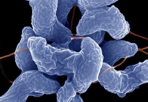 最近科学家发现,空肠弯曲菌和c. coli菌通过杂交过程,开始结合成一种新病菌。虽然它们共享大约85%的遗传密码,但是这两种病菌存在很大不同,它们生活在鸡、牛和其他家畜的内脏里。然而,由于工业化农业导致家畜更加密集的生活在一起,使得空肠弯曲菌和c. coli菌接触更为密切,从而使它们很容易通过杂交交换基因。这张假彩色电子显微镜图片显示的是簇拥在一起的弯曲菌属细胞。