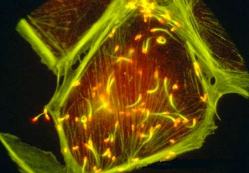 杆状细菌李斯特菌利用“肌动蛋白火箭(actin rockets)”即已知的“彗尾(comet tails)”感染并穿过白细胞。肌动蛋白火箭的工作原理如下:一个蛋白质在这种细菌的隔膜上抛锚,导致肌动蛋白迅速发生聚合反应,这个过程产生爆发式推进力,使得杆状细菌李斯特菌能够穿过白细胞的隔膜,到外面感染其他细胞。这张图片显示的是杆状细菌李斯特菌(红色)利用明亮的肌动蛋白火箭在一个细胞周围移动。