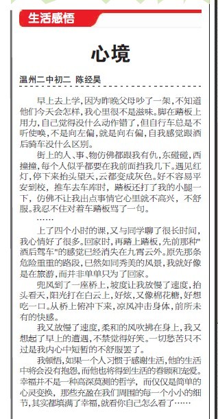 童联社温州作文网中学班学员陈经昊(温州第二中学初二)佳作《心境》在2010年8月2日温州日报作文版发表。