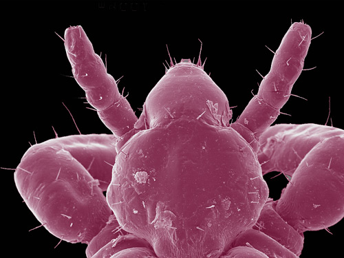 本图中的寄生虫就是只发现于人类身上的头虱。人类头皮的热度可以保证头虱的卵在大约一周内孵化,头虱大约可以活一个月左右。头虱感染是人类世界最流行的一种外部寄生虫感染。与体虱不同的是,头虱不会传染疾病,而且它们的感染症状相对较轻。