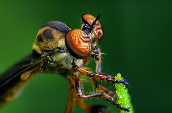 又是一只生着令人难以置信的神奇复眼的食虫虻。它的复眼饱含着生命的光芒,透射出摄人心魄的致命吸引,不仅美不胜收,更是捕猎食物和躲避天敌的重要武器。食虫虻是如此机敏轻盈,以至于摄影师托马斯•夏汉费了九牛二虎之力,才如此近距离地拍摄到这么精彩的瞬间。