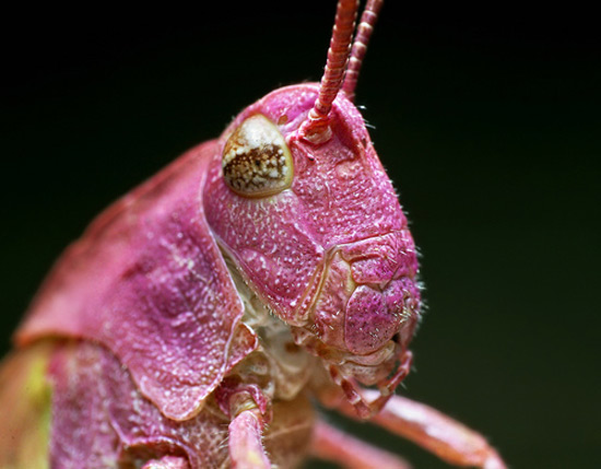 蚱蜢颜色一般都在绿色到棕色之间徘徊,虽然粉红色蚱蜢还是第一次见到,但这是自然产生的物种,并非变异或环境影响造成的。