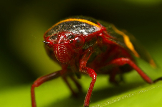 图中绚丽多彩的昆虫是一个背后有两条线的沫蝉。沫蝉的身体粗短,色彩艳丽,不擅长飞行,但却有一对跳跃能力很强的后腿,可以在面对天敌时像青蛙般一跃而起,然后逃之夭夭。因此,沫蝉在英文中的俗名是“蛙蝉”。最新研究证明,沫蝉打破了由跳蚤保持的跳高纪录,是自然界新的“跳高冠军”。沫蝉的平均身长只有6毫米,却能跳700毫米高,相当于自己身高的100倍,这大约相当于一个人一跃而起,跳到70层楼的高度!
