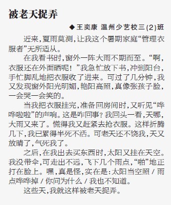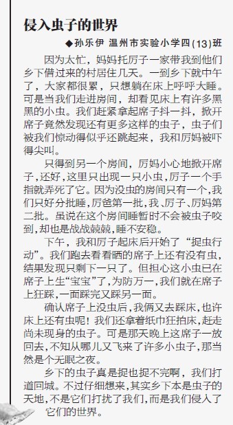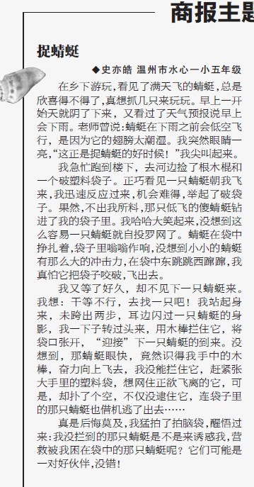 童联社温州作文网学员史亦皓(温州水心一小五年级)佳作《捉蜻蜓》、王奕康(温州少艺校三年级)佳作《被老天捉弄》、孙乐伊(温州实验小学四年级)佳作《侵入虫子的世界》在2010年8月8日温州商报新作文版发表。