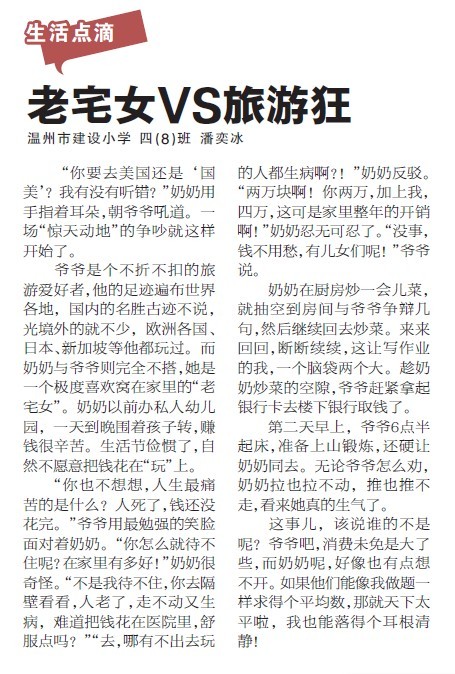 童联社温州作文网学员潘奕冰(温州市建设小学四年级)佳作《老宅女和旅游狂》发表在温州都市报新苗版。