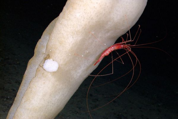 在这张由“俄刻阿洛斯探险者”号探险小组公布的照片中,一只长腿小虾吸附于海绵之上。他们在0.5英里(约合0.8公里)的海洋深处,发现了最初看上去像是“公园中的美丽花朵”。据美国国家海洋与大气管理局专家介绍,科学家后来确认它可能是一种新的食肉海绵。新发现的海绵看上去具有粘性玻璃针状物,可以慢慢伸出去捕捉食物——极有可能是路过的浮游生物。