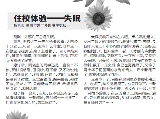 童联社温州作文网学员徐余佳作《我和他》、杨凯迪佳作《失眠》、邱嘉芮佳作《包老师的包容》在2010年10月3日的温州商报“新作文”版发表。