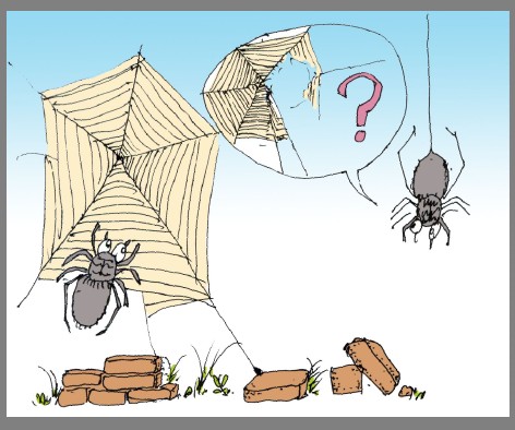 一座破旧的庙里住着两只蜘蛛,一只在屋檐下,一只在佛龛上。一天,旧庙的屋顶塌掉了,幸运的是,两只蜘蛛没有受伤,他们依然在自己的地盘上忙碌地编织起蜘蛛网。没过几天,佛龛上的蜘蛛发现自己的网总是被搞破。一只小鸟飞过,一阵小风刮起,都会让它忙着修上半天。它去问屋檐下的蜘蛛:“我们的丝没有区别,工作的地方也没有改变。为什么我的网总是会破,而你的却没事呢?”屋檐下的蜘蛛笑着说:“难道你没有发现我们头上的屋檐已经没有了吗?”
