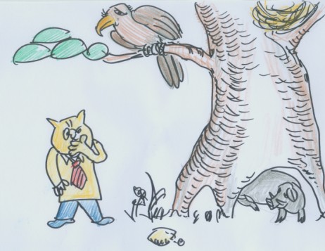 大的橡树上住着三种动物:老鹰住在树梢上筑巢,养育幼雏;猫住在树干中间,生下几只小猫;野猪一家人,则藏身大树根处的洞里。原本它们互不侵犯、和谐相处;可是猫渐渐地想独占整棵大树,便想了一个坏主意。首先,它爬到老鹰那里说:“下面的野猪天天向上拱,迟早会把我们的大树拱倒,那时我们就成了它的盘中餐。”老鹰听了,就开始不安了起来。接着,猫又树下告诉野猪:“你要小心,老鹰正盯着你的孩子,你一旦出门打猎,它就会动手。”野猪也被吓住了。从此,猫白天装作害怕呆在家里,夜里偷偷出去觅食;而老鹰和野猪却因为听信了猫的谗言,整日守在家中不敢外出觅食。结果,断了食物来源,老鹰和野猪两家坐吃山空,一个一个都饿死了。猫的阴谋终于得逞。