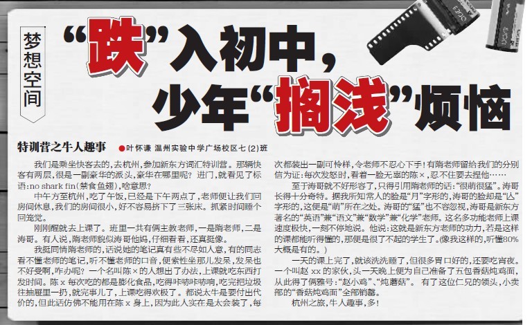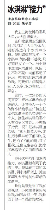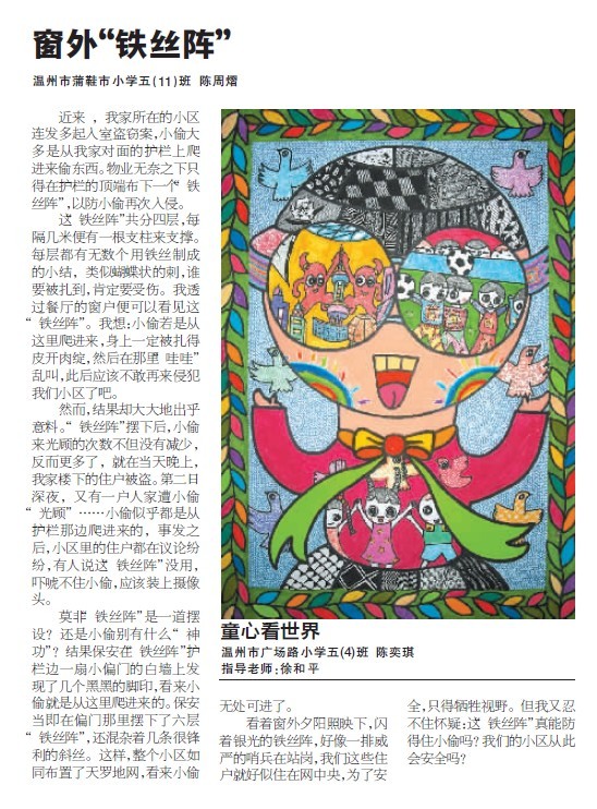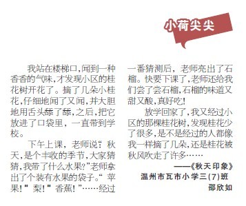 童联社温州作文网学员陈周熠佳作《窗外的“铁丝阵”》、邵欣如佳作《秋天印象》、朱子彦《冰激凌“接力”》、叶怀谦佳作《特训营牛人趣事》分别在2010年10月31日《温州都市报》新苗版、《温州商报》新作文版发表。