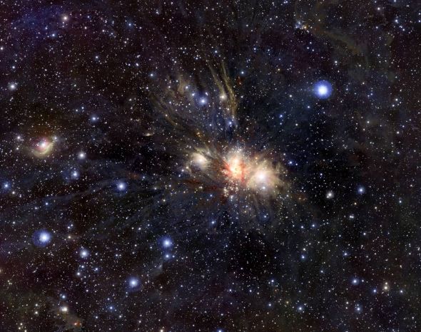 这幅生动的红外图片公布于10月6日,图片显示了距离地球大约2700光年的一个恒星形成区。麒麟座r2是一个巨大的炽热年轻恒星集合,它照亮了一系列美丽的反射星云。本图由位于智利的欧洲南方天文台可见光和红外线勘测天文望远镜所拍摄。