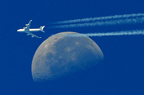9月30日,从法国马蒂格向天空看去,一架波音747客机正从月亮的面前飞过。
