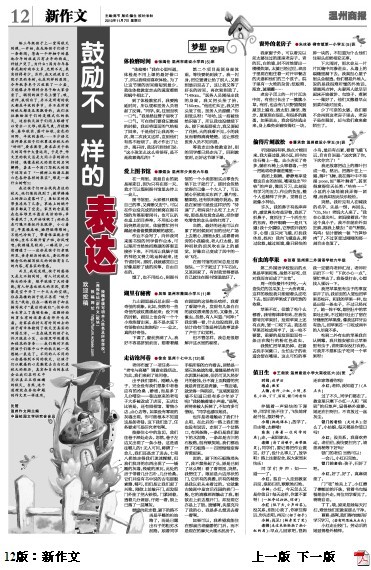童联社温州作文网习作专版“鼓励不一样的表达”发表在温州商报2010年11月7日的新作文上,张嫣伦的《体检磨时间》、滕煜如的《爱上图书馆》、张萌的《有虫的苹果》、朱冰姿的《窗外的老房子》、吴限的《湖里有秘密》、潘承前的《偷得片刻放松》、徐余的《走访沧河街》集体发表。