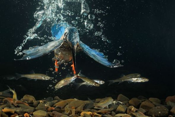 一只翠鸟俯冲潜入水中捕鱼,翅膀张开以减缓下落速度。这幅照片在2010年欧洲野生动物摄影比赛“水下世界”单元获得一致好评。