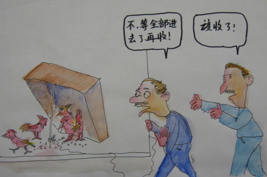 一天,有12只火鸡进入箱子里,不巧1只溜了出来,他想等箱子里有12只火鸡后,就关上门,然而就在他等第12只火鸡的时候,又有2只火鸡跑出来了,他想等箱子里再有11只火鸡,就拉绳子,可是在他等待的时候,又有3只火鸡溜出来了,最后,箱子里1只火鸡也没剩。