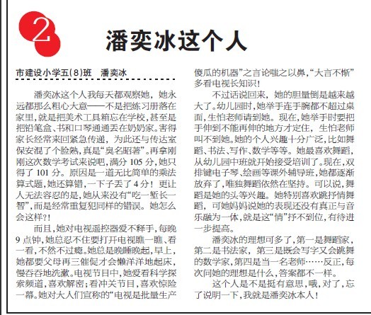 童联社温州作文网学员潘奕冰参加温州日报“审视自我”征文,其《潘奕冰这个人》于2010年11月10日温州日报发表。