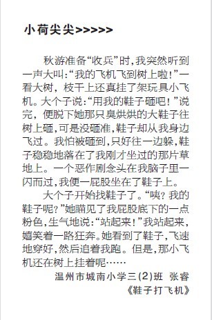 童联社温州作文网三年级小学员城南小学张睿习作《鞋子打飞机》发表在2010年11月14日温州都市报新苗版。