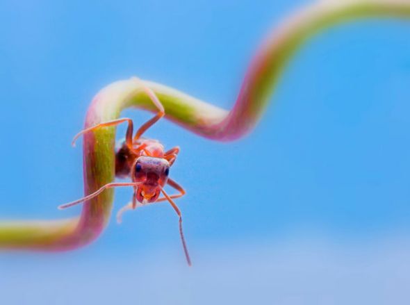 一只好奇的小蚂蚁正在向巴斯的镜头看。如果巴斯计划拍摄某种动物,他每一次在离家外出前,都要认真研究这种动物。因此,他能够预测到动物们的下一个动作,并预料到最佳镜头。