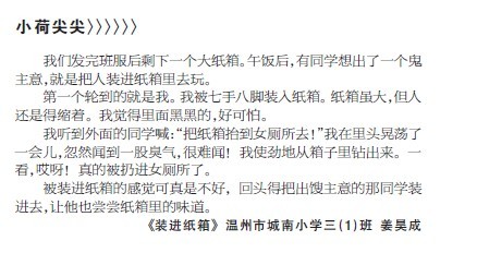 童联社温州作文网学员姜昊成(温州市城南小学三年级)佳作《装进纸箱》发表在2010年12月12日温州都市报新苗版。