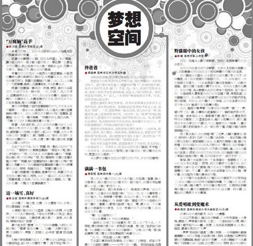 童联社温州作文网学员徐丛宜《这一场雪,真好》(温州市外国语中学八年级)、林炜杰《从爱唱歌到变魔术》(温州建设小学六年级)、林璐《野猫眼中的女孩》(温州第二中学初一)、胡益洲《馋爸爸》(温州市瓦市小学五年级)、沈力诺(温州少艺校五年级)《“豆腐脑”高手》发表在2011年2月8日温州商报新作文版。